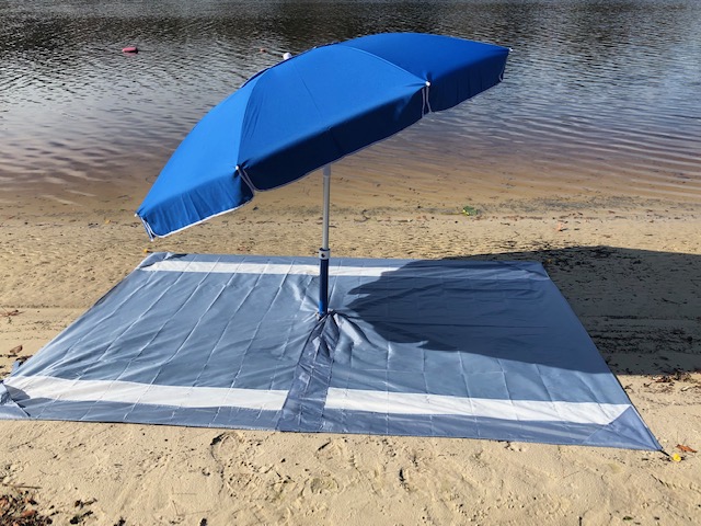 Beach Mat: This beach mat is made to be super thin and lightweight. It is pending beach mat made from rip-stop 220T nylon where it can be thin and not tear with large a 7ft x 9ft foot print. The beach mat has a hole in the center with closures where the mat can be used with or without the AugBrella anchor. Sand will not stick to the mat which makes it easy to keep clean. The mat includes 4 stakes for use on grass, and the corners are pocketed so you can add sand, or water bottles to keep the mat from blowing around. The beach mat can be used with or without an umbrella. Just add your towel to lay on and may the surface to make it soft and sand-free.